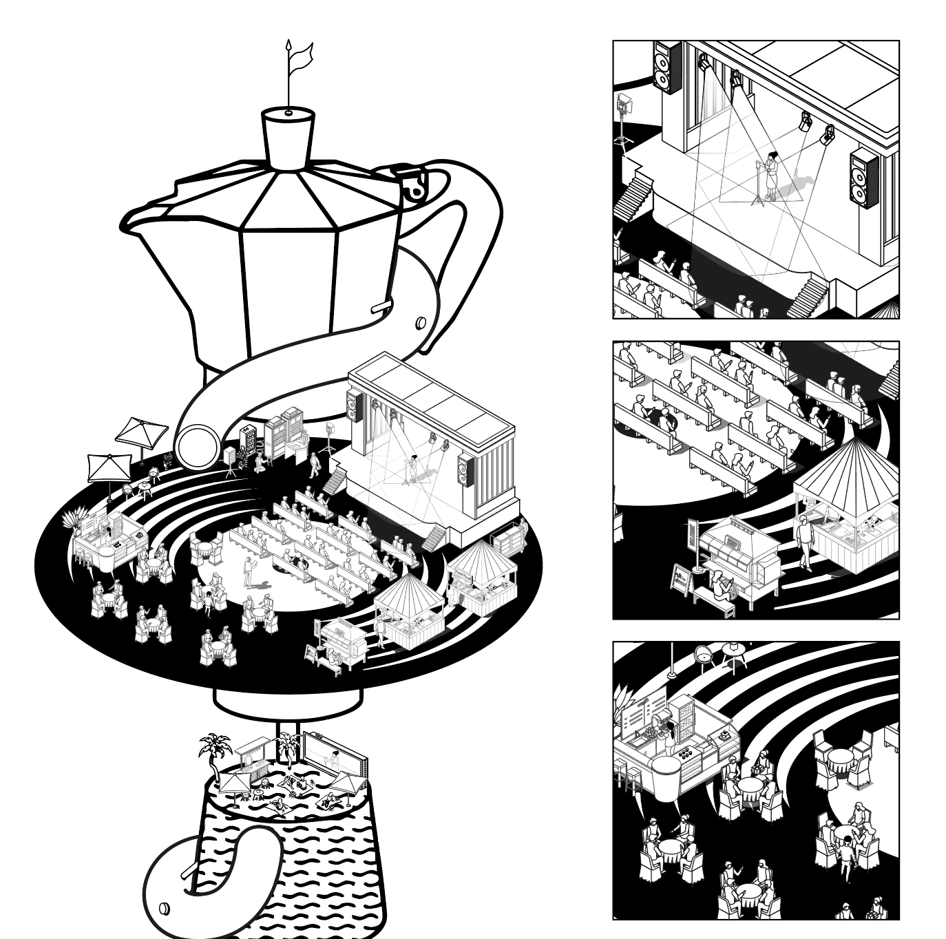 Rebranding desenvolvido para a White Coffee Agency, combinando dois símbolos inesperados — uma cafeteira e um disco de vinil — para criar uma identidade visual que representa energia, ritmo e celebração.
